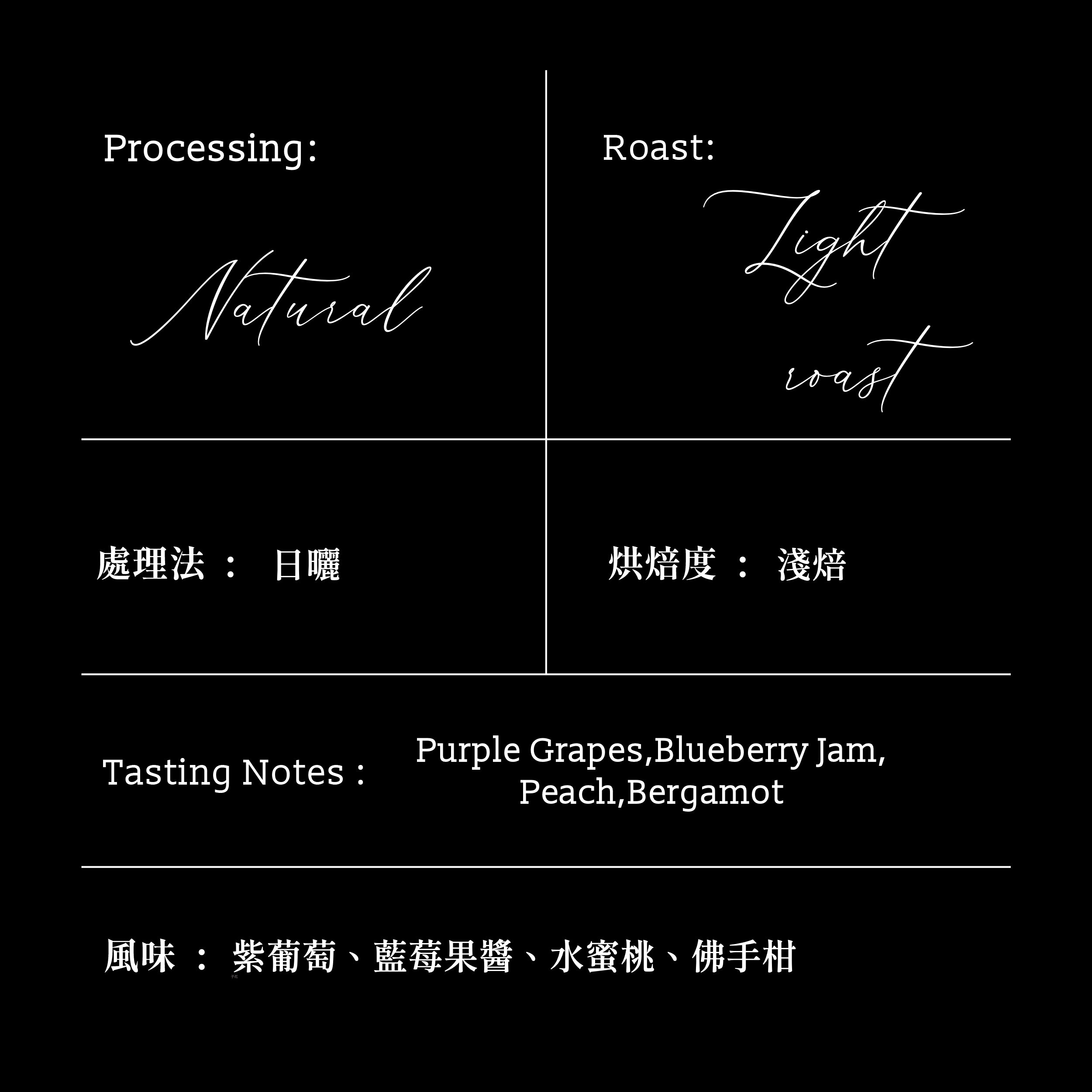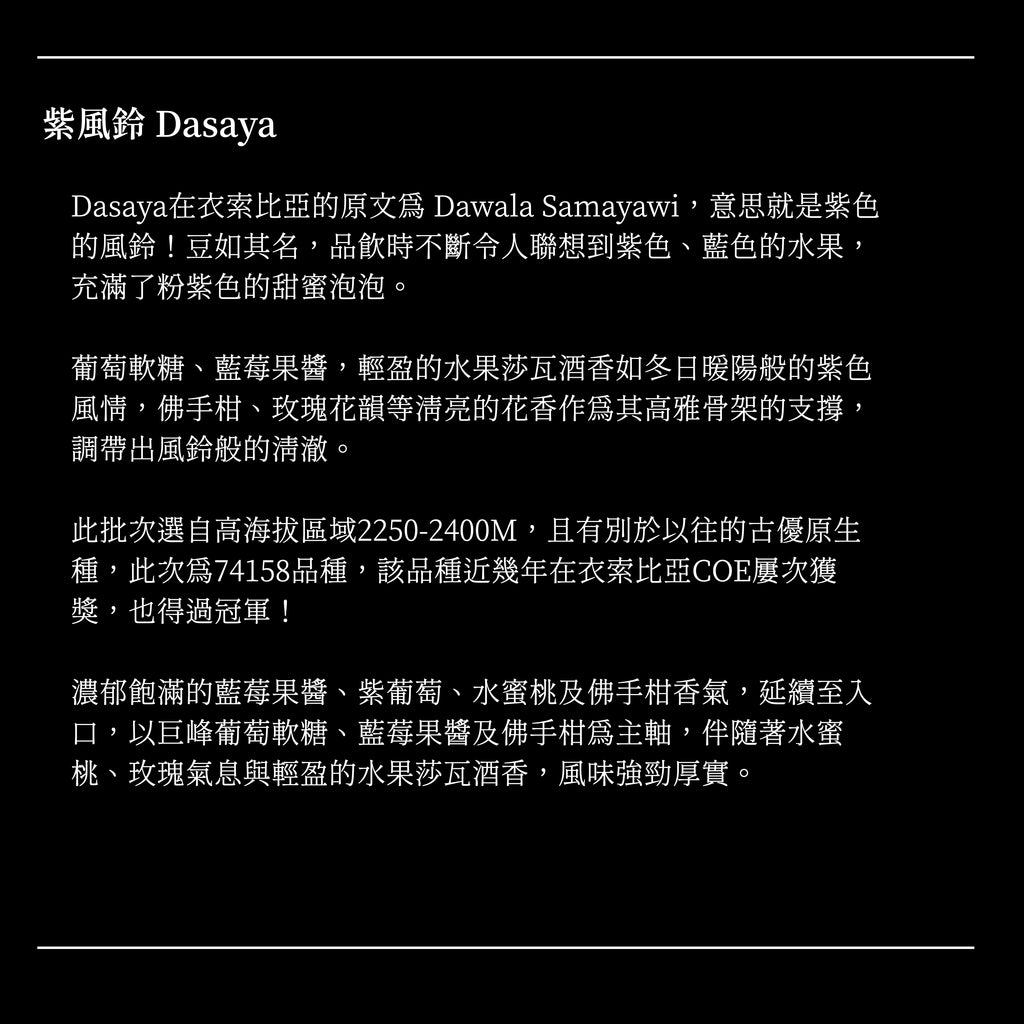 Dasaya在衣索比亞的原文為 Dawala Samayawi,意思就是紫色的風鈴!豆如其名,品飲時不斷令人聯想到紫色、藍色的水果,充滿了粉紫色的甜蜜泡泡。